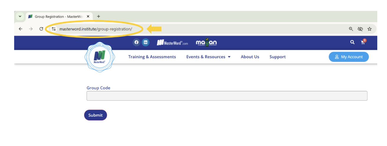 After logging in to your MasterWord Institute account, in the same browser tab, type or paste masterword.institute/group-registration into the address bar
