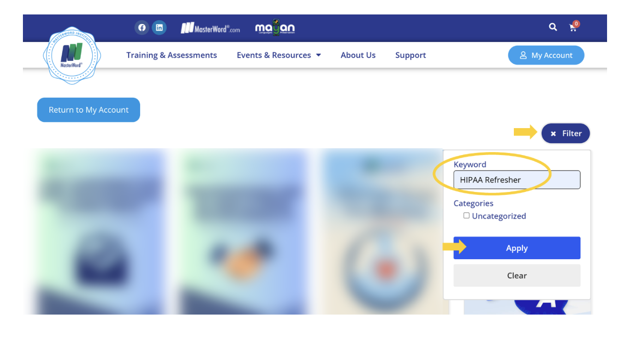 Alternatively, you can search your course library by clicking on “Filter” button in the right top corner and typing “HIPAA Refresher” in the search bar, and clicking “Apply”: