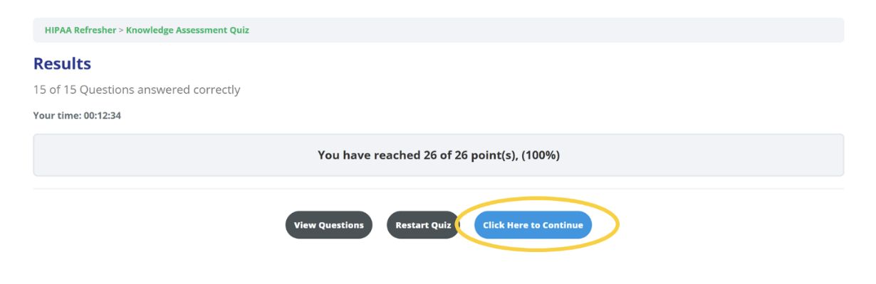Once you open the course, under the “Course Content” section, watch the “HIPAA Refresher Course Video” (21 minutes), and then complete the “Knowledge Assessment Quiz”.