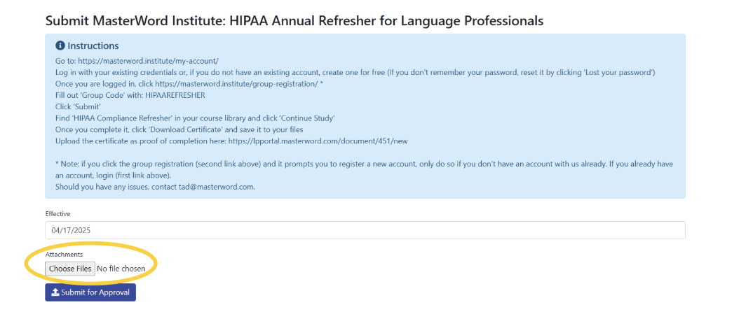 If you have questions or need assistance with accessing the LP Portal or uploading your certificate to LP Portal, please contact us via our Language Professional Help Desk.
